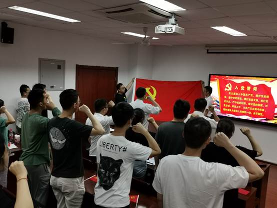 党员们穿着整齐、胸佩党徽,面带笑容来到理科南楼F304会议室。全体党员起立同唱《国际歌》,在党总支书记李俊龙的带领下,举起右手庄重严肃地重温入党誓词,追忆入党初心,牢记使命担当
