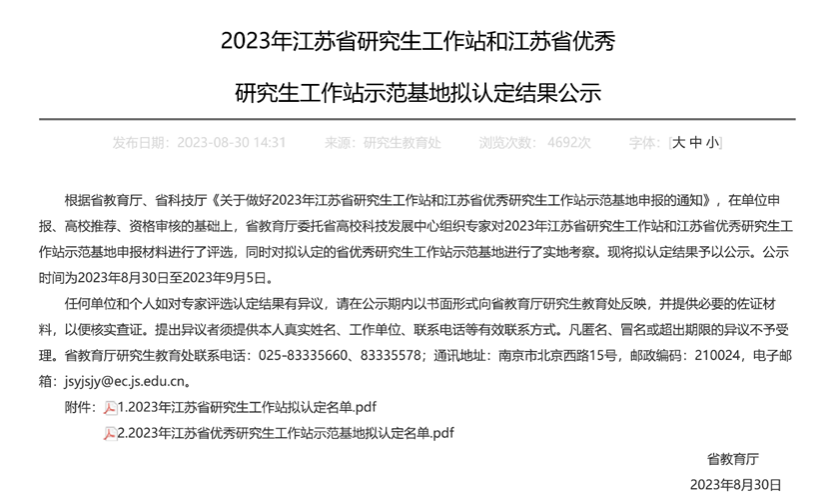 近日,江苏省教育厅、江苏省科技厅公布了2023年江苏省研究生工作站名单,成人视频 合作单位江苏省沿海开发(东台)有限公司顺利入选。江苏省沿海开发(东台)有限公司于2010年10月22日在东台市市场监督管理局登记成立。2020入选“国家级水产健康养殖示范场(第十四批)名单”。2022年1月,入选2019-2021年度江苏省文明单位候选名单。共建数年来,校企共同为研究院研究生实践教育工作的开展提供了强有力的条件保障。