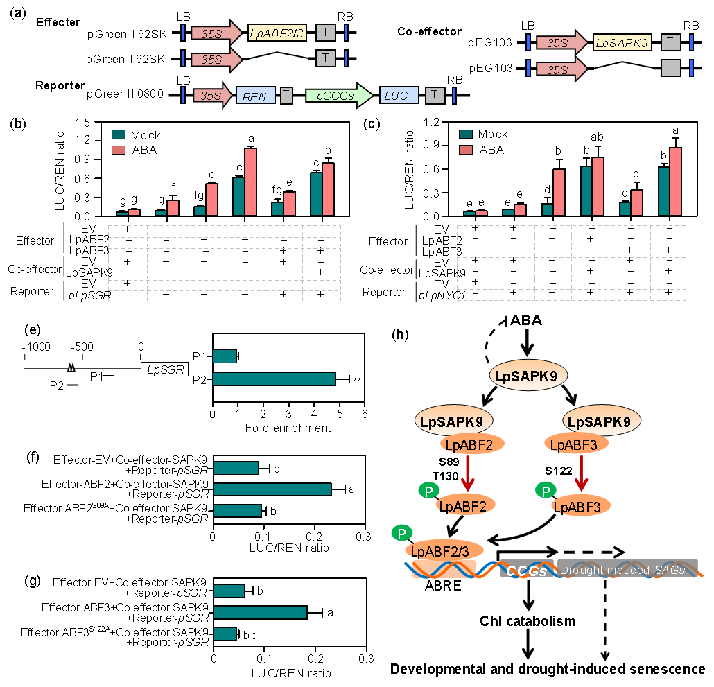 图2. LpSAPK9调控ABF2/3转录活性及“LpSAPK9-LpABF2/3-CCGs”模块调控叶片衰老调控的模式图