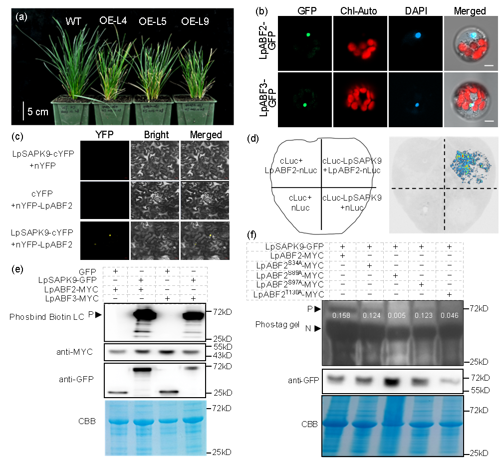 图1. LpSAPK9与LpABF2/3互作及磷酸化位点验证