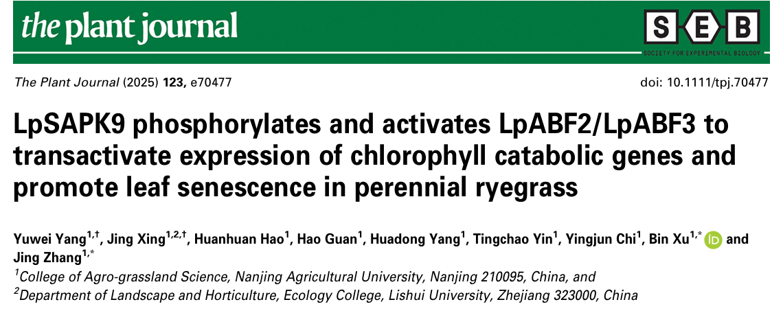 徐彬教授研究组在The Plant Journal上发表了题为“LpSAPK9 phosphorylates and activates LpABF2/LpABF3 to transactivate expression of chlorophyll catabolic genes and promote leaf senescence in perennial ryegrass”的研究论文。多年生黑麦草是我们南方草山草坡的主栽草种。为提高黑麦草在南方草山草坡的高温干旱等极端环境下成活率和使用年限,我们开展了其耐热、抗旱及衰老机理相关研究工作。本研究发现LpSAPK9通过磷酸化ABA信号传导通路关键转录因子LpABF2和LpABF3,进而诱导叶绿素降解基因表达,促进叶片衰老的分子机制。