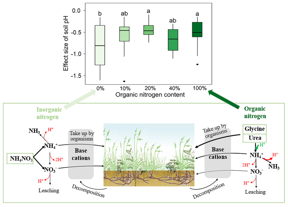 Meta分析发现,与无机氮添加相比,有机氮添加能够有效地降低土壤酸化速率(尤其是在高氮添加速率下)。五年的野外实验也与Meta分析的结果相一致,并进一步明确氮添加中的有机氮能有效缓解土壤酸化,且在有机氮含量20%的有机无机氮组合添加下土壤酸化速率最低(图2)。酸化速率降低的内在机制是由于有机氮产生H+的速率相对较低,因为 NH3的挥发以及内蒙古草地的优势物种羊草(Leymus chinensis)可以利用有机氮和 NH4+(该过程H+产生的净贡献率均较低),最后导致硝化反应(对H+产生的净贡献率较高)所需的NH4+较少(图2)。此外,该研究组还发现氮添加中的有机氮也能有效降低温室气体 CO2和 N2O的排放,该项研究于2021年发表在Environmental Pollution 。