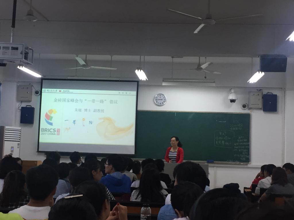 随后,朱娅老师为我们作了金砖国家峰会与“一带一路”倡议主题的培训。朱娅老师为我们介绍了金砖国家峰会的发展历史及未来展望。过去十年中,金砖国家的经济总量在世界经济中的比重由12%上升到23%,对世界经济增长的贡献率超过50%。而此次在厦门召开的金砖国家峰会,意味着金砖国家峰会将进入第二个黄金时代,开始进入中国时刻。朱老师也提出,金砖国家的合作也面临一些“烦恼”,如金砖国家整体增速放缓,部分成员国政治动荡等。此次峰会中,中国也就未来的发展贡献出“中国方案”,提出包括“聚焦深化务实合作,促进共同发展”等在内的四个领域重点。