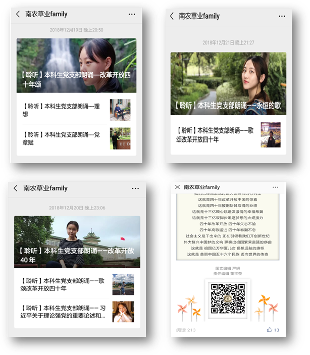 本科生党支部结合“互联网+”思维方式,精心挑选12篇歌颂改革开放四十周年的文章,通过深情朗诵,表达了学生党员对改革开放四十周年的理解与歌颂。借助学院“草业Family”公众号,将精心编辑的诵读内容通过新媒体平台进行传播,增强受众面,实现了从党支部内部学习到带动其他团员青年学习的目标,而且通过社交平台的互动方式,得到更多的支持与反馈渠道,充分调动、发挥基层党支部主体作用,提升了党员群体的参与感。