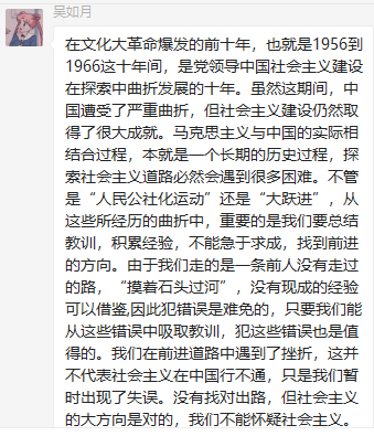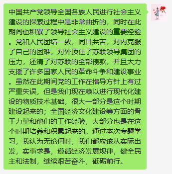 党支部各党员在群里积极发表学习心得。郑钰莹同志提出要杜绝个人专断和个人崇拜,通过制度和法律进行约束,保持党的先进性。宋俊龙同志提出为了避免重蹈社会主义建设过程中出现的错误,我们党必须坚定不移地坚持实事求是的思想路线。罗思敏同志提出虽然国家在社会主义建设过程中遭受过严重挫折,但社会主义建设仍然取得了很大成就。