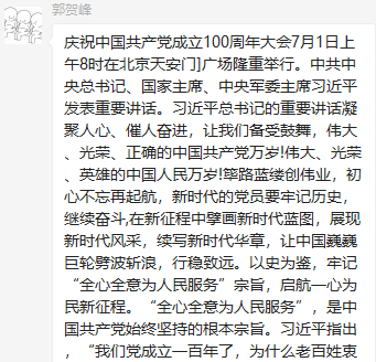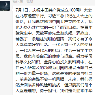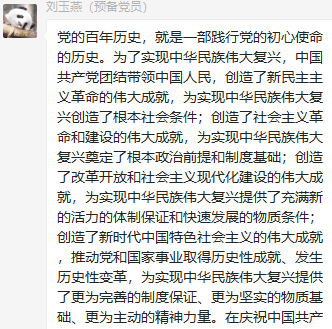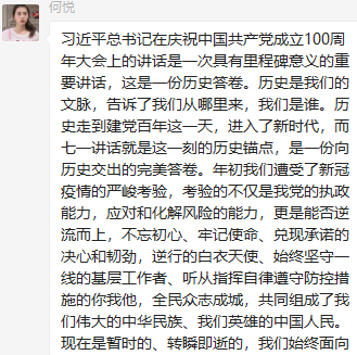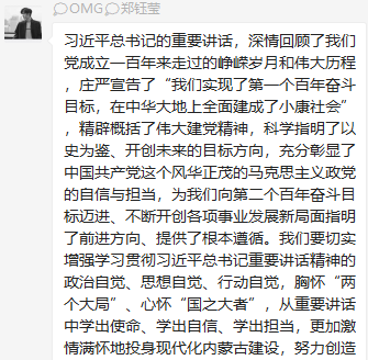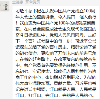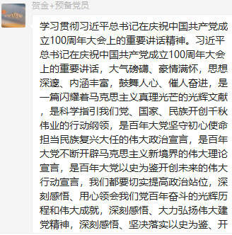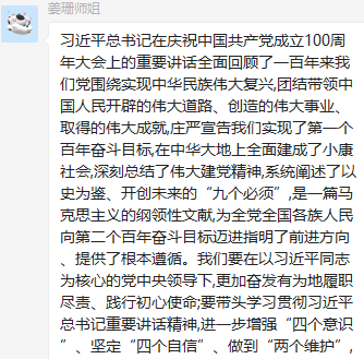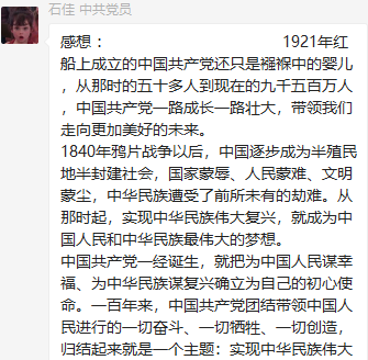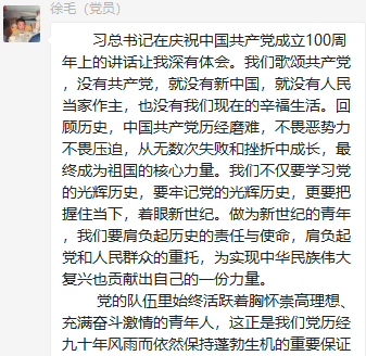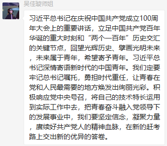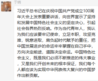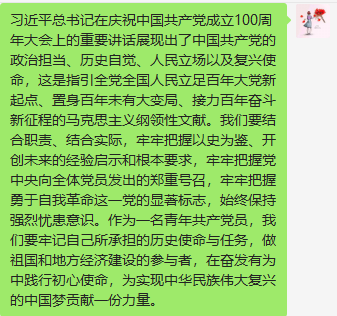 董瀛潞同志在成人视频 研究生第三党支部党员群中分享了与习近平总书记在庆祝中国共产党成立100周年大会上的重要讲话相关的资料和视频,党支部各党员在群里积极发表学习心得。中国共产党的先驱们不怕牺牲、英勇斗争,开创了中国历史新纪元。我们要继续弘扬光荣传统、赓续红色血脉,永远把伟大建党精神继承下去并发扬光大。作为新时代的青年党员,我们要以实现中华民族伟大复兴为己任,牢记“请党放心、强国有我”的铮铮誓言,长志气、有骨气、添底气,成为堪当民族复兴重任的社会主义建设者和接班人。