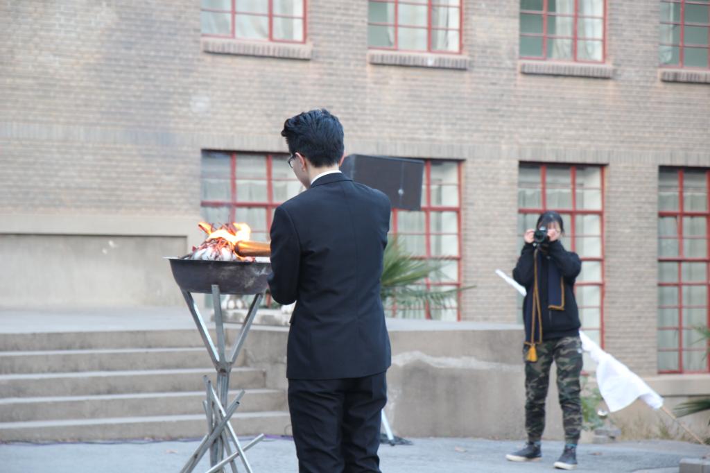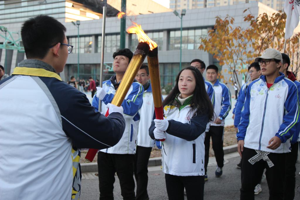 火炬传递围绕学校一圈后,全体同学将火炬传递回主楼南门前。校学生会副主席王志远接过由纠察队护送的火炬,将火炬盆点燃。