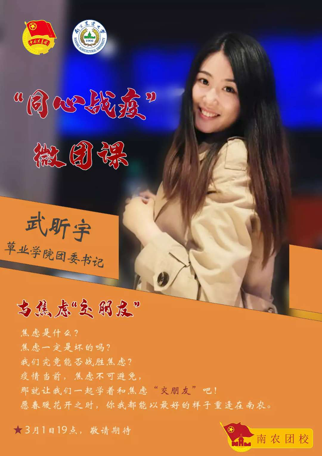 党旗所指,团旗所向。自疫情爆发以来,南农团委按照学校党委和上级团组织有关部署,引领广大青年积极落实各项疫情防控措施。为了帮助南农学子克服焦虑情绪,调节心态全身心投入新学期的学习生活,学校特别邀请到了草业院团委书记武昕宇老师,为南农师生精心打磨一堂线上战”疫“微团课,教大家在疫情面前,学会与情绪和解,与焦虑“交朋友”。