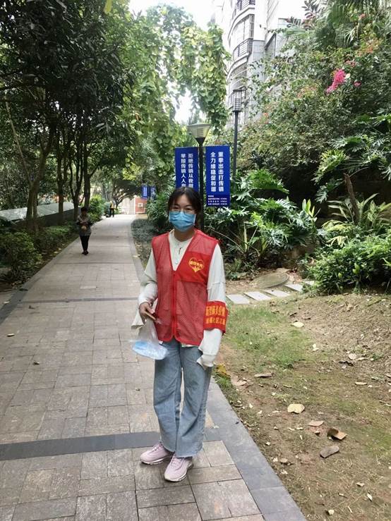 的学生干部,我有义务参与疫情防控工作,虽然与一线医护人员的风险相比不值一提,但我会在做好自我防护的前提下,尽心尽力为社区居民服务,用行动向一线人员致敬。”在社区书记的指挥下,她主要负责为行动不便的居民运送生活必需品,排查登记湖北返邕居家隔离的人员,并为他们送去口罩、体温计等防护用品。在小区巡逻时,面对不戴口罩的居民,她也会耐心劝导。