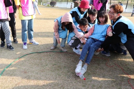 第二个项目是同心鼓。游戏开始时,每组所有人都上场,每个人拉着鼓的一根绳子,每个队员牵拉一根绳子,保证鼓面水平。同时另选出一名队友将一个排球从鼓面中心上方竖直抛下,队员们齐心协力将球颠起,颠球次数最多者胜出,颠的次数最少的组享受抽签惩罚。该项目非常考验团队协作能力,需要每个人的通力配合,最后大家的成绩都很不错,最高的组颠了118次。同心鼓项目还引来附近小朋友的热烈加油,现场气氛燃到极点。