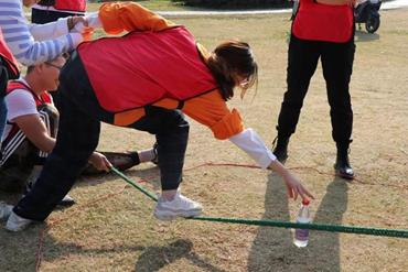 游戏开始时,每组所有人都上场,每个人拉着鼓的一根绳子,每个队员牵拉一根绳子,保证鼓面水平。同时另选出一名队友将一个排球从鼓面中心上方竖直抛下,队员们齐心协力将球颠起,颠球次数最多者胜出,颠的次数最少的组享受抽签惩罚。该项目非常考验团队协作能力,需要每个人的通力配合,最后大家的成绩都很不错,最高的组颠了118次。同心鼓项目还引来附近小朋友的热烈加油,现场气氛燃到极点。