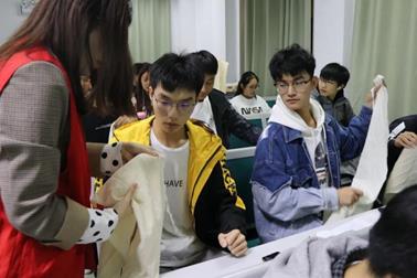 接下来另外两位主讲员为同学们介绍了基本的绞紧止血法。同学们在聆听到主讲者的详细解释后也进行了动手操作,同学们听得津津有味,做的认认真真,大家在欢声笑语中掌握急救知识技能。虽然很多同学的包扎不太标准,但是现场的工作人员也会去热心地亲自为他们解释教授正确的方式。