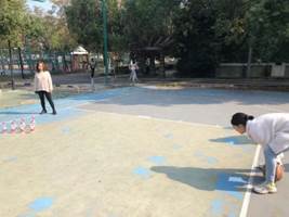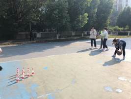 除了紧张刺激的5V5对抗,本次篮球友谊赛还设有趣味项目,让男生女生都能参与进来。如三分定点投篮,则是参赛选手站在三分线内外不同角度分别投篮,命中则得分;除此之外还有趣味项目“保龄球”,即将矿泉水摆放成三角状,滚动篮球进行击打,以三次累加击倒次数多者为冠军。除了正赛,趣味项目也吸引了不少同学参加。