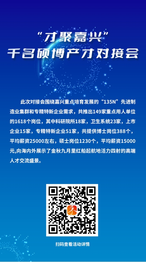 此次对接会围绕嘉兴重点培育发展的“135N”先进制造业集群和专精特新企业需求,共推出149家重点用人单位的1618个岗位,其中科研院所18家,卫生系统23家,上市企业15家,专精特新企业51家,共提供博士岗位388个,平均薪资25000左右,硕士岗位1230个,平均薪资15000元,向海内外展示了金秋九月里红船起航地活力四射的高端人才交流盛景。诚邀硕博人才投递简历,来嘉就业创业,共建大美嘉兴。