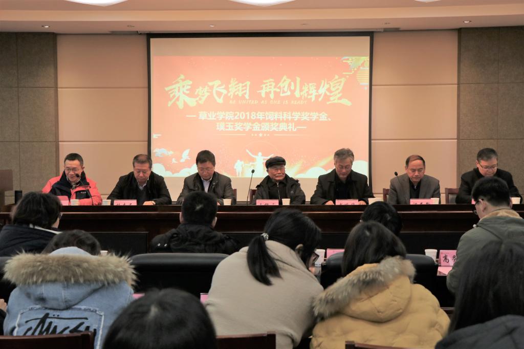 在行政北楼会议室举行了“2018年饲料科学奖学金、璞玉草业科学奖学金颁奖典礼”。86岁高龄的王槐三教授、校发展委员会张红生主任、江苏波杜农牧股份有限公司尤佩华总经理等嘉宾应邀出席,学院党总支书记李俊龙 、副书记高务龙以及全体教师、研究生和部分本科生参加了会议。典礼由成人视频