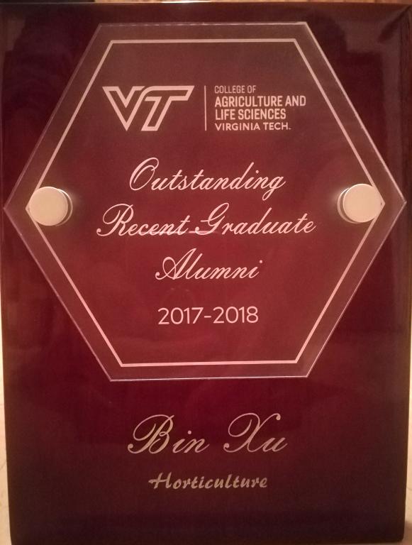 徐彬副教授获得美国弗吉尼亚理工大学农业与生命科学学院近期毕业生优秀校友奖(Outstanding Recent Graduate Alumna),受邀参加弗吉尼亚理工大学农学院的颁奖仪式和晚宴,并做了题为“Extending leaf greenness period for better turf and forage grasses”的学术报告。
