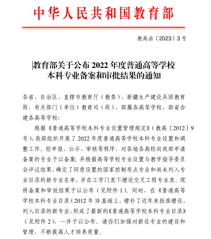 近日,教育部下发《教育部关于公布2022年度普通高等学校本科专业备案和审批结果的通知》(教高函〔2023〕3号)文件,其中成人视频
