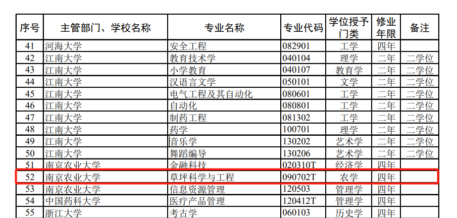 草坪科学与工程(090702T)专业获批为2022年度普通高等学校新增备案本科专业,计划自2023年开始招生。